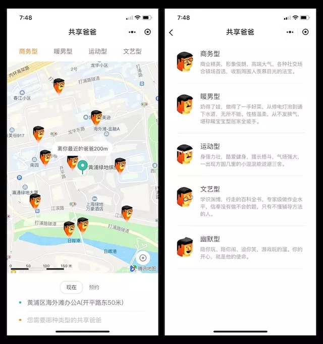 用户可以在不同地点,筛选 5 种不同的共享爸爸的类型,熟悉商务社交、料理等不同领域。用户在用 0 元尝鲜价点击“呼叫”共享爸爸时,手机界面会跳转至上述的广告片,末尾则跳转至一个欧派“0 元预约”的页面。