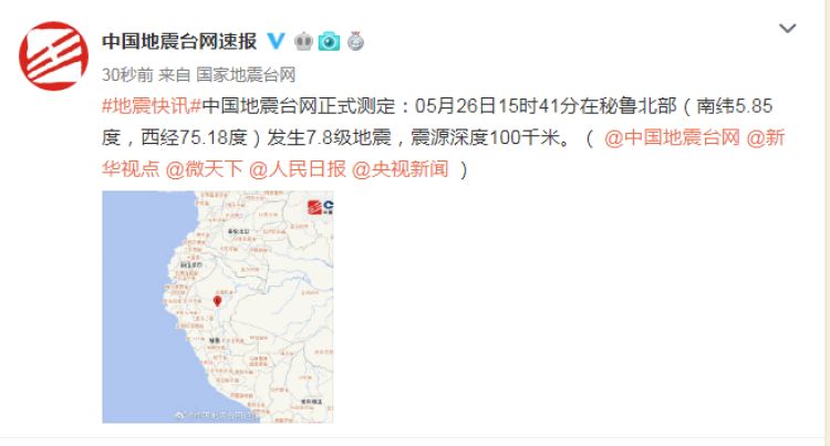 中国地震台网正式测定:05月26日15时41分在秘鲁北部(南纬5.85度,西经75.18度)发生7.8级地震,震源深度100千米。