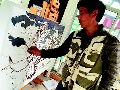 图为:熊庆华正在画他的新作品《钓鱼》。