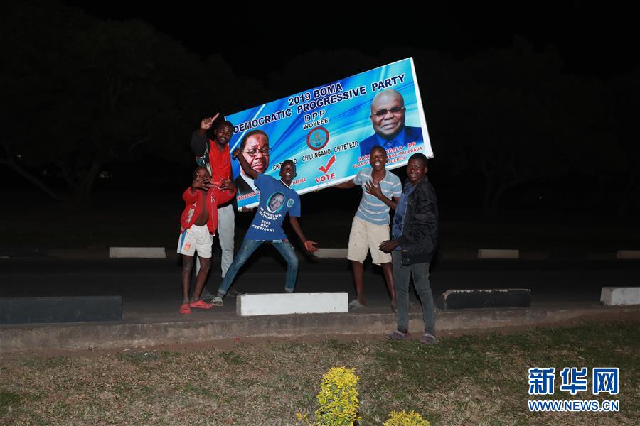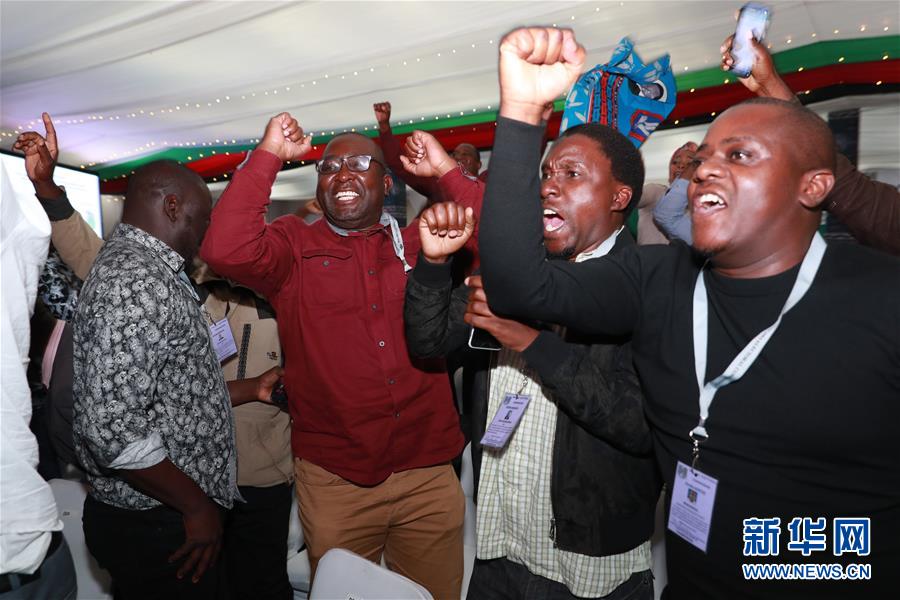 - 5月27日,马拉维执政党民主进步党成员在布兰太尔全国计票中心庆祝胜利。 马拉维选举委员会27日在布兰太尔公布了21日举行的总统选举结果,现任总统、民主进步党领导人彼得·穆塔里卡成功连任,任期5年。 新华社记者 彭立军 摄