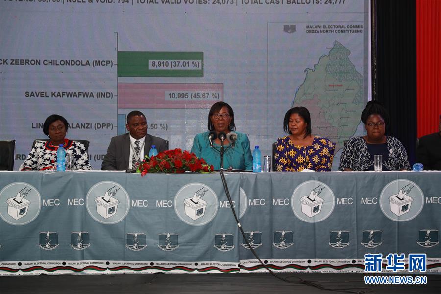 - 5月27日,在马拉维布兰太尔,马拉维选举委员会主席简·安萨(中)宣布大选结果。 马拉维选举委员会27日在布兰太尔公布了21日举行的总统选举结果,现任总统、民主进步党领导人彼得·穆塔里卡成功连任,任期5年。 新华社记者 彭立军 摄