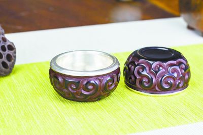何鹏飞的创新还体现在采用多种胎体上。古代剔犀以木胎为主,现在则有陶胎、瓷胎、金属胎,实现传统工艺“1+1>2”的效果。2015年,何鹏飞在清华美院非遗研修班上结识了其他的非遗传承人,并与他们合作制成一批创新产品,例如,与浙江婺州窑传承人陈珩合作的大茶盘,使青瓷与大漆各显其美;与云南建水紫陶传承人田静合作的哈尼茶储,使紫陶与大漆两种材料相得益彰,浑然天成;与安徽徽州犀皮漆传承人俞钧鹏合作的剔犀皮盒,在质地厚重和色彩变化间形成美妙的对比;与浙江嵊州竹编传承人吕成合作的扇形盒,将竹胎与大漆紧密结合;与青海银铜器传承人何满合作的茶杯,一问世即被抢购一空。
