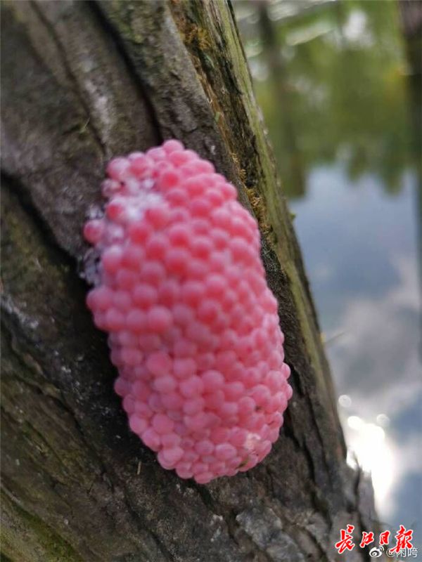 网友“闲咵”介绍,这个粉红色的福寿螺卵块,粘在园博园景区长江文明馆前水池中水杉树上。卵块内,有密密麻麻的卵子。他认为,卵块是在水池中的福寿螺产下的。他建议园方派人将卵块及福寿螺消灭掉。