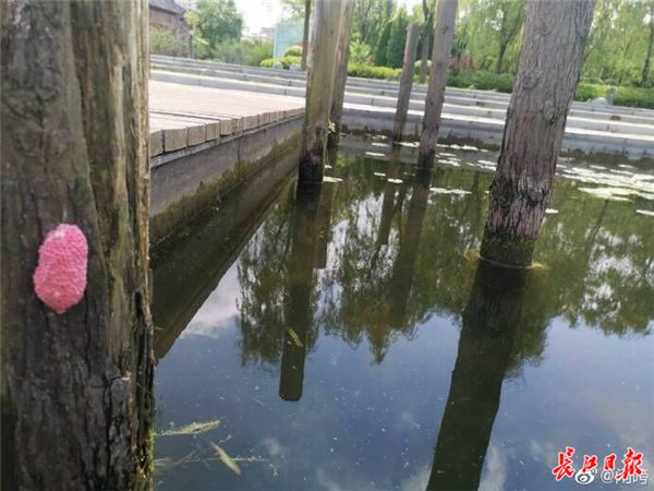 长江日报融媒体5月28日讯(记者陈奇雄)5月27日,一位网友到武汉市园博园景区游玩时,看到园内水池中大树树干上,竟悬挂着福寿螺卵团块。他希望园方能将福寿螺卵及福寿螺活体剿灭,以保护园内其他的水生动植物。