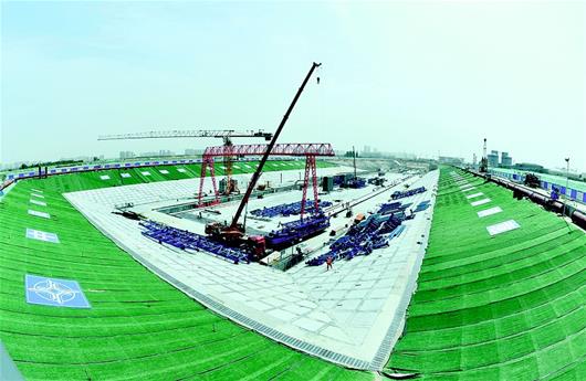 5月27日,襄阳东西轴线鱼梁洲段项目工地,中交二航局工人在东汊干坞拼接沉管预制模板。