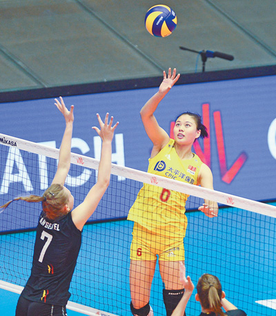 5月29日,中国队球员龚翔宇(上)在比赛中扣球。当日,在中国澳门综艺馆举行的世界女排联赛澳门站比赛中,中国队以3∶0战胜比利时队,取得本站比赛两连胜。在此前一天的比赛中,中国队以3∶0战胜泰国队。