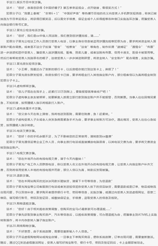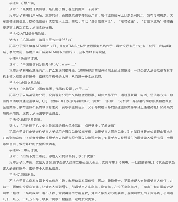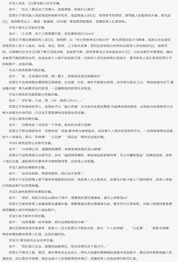 报告归纳了47种常见诈骗手法,包括QQ冒充熟人好友诈骗、冒充公司老总诈骗、微信假冒代购诈骗、微信发布虚假爱心传递诈骗等。