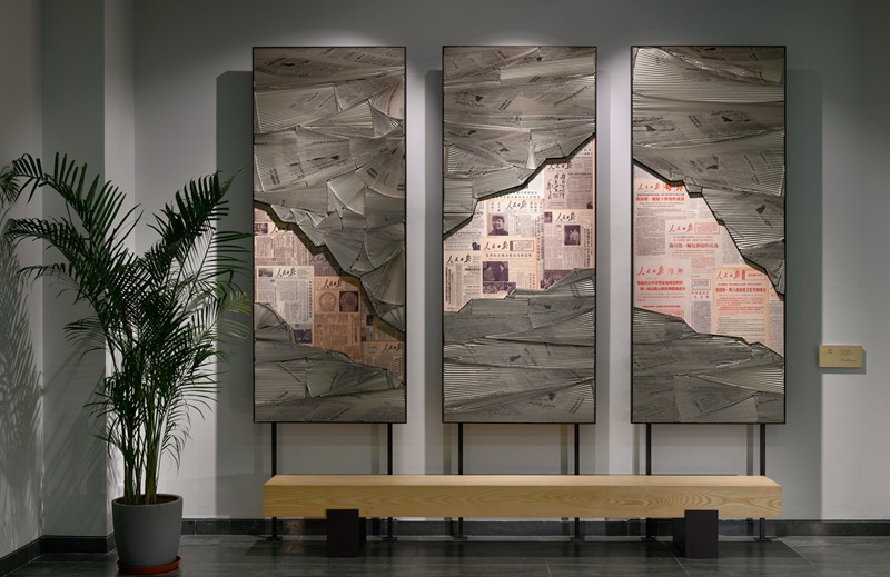于红权用一些四、五十年代的老报纸,经过艺术的变形和加工,把人民日报社的历史、文化底蕴展示在墙面上,融合了传统的元素和现代的表现手法,形象地展示出人民日报社在新中国历史中举足轻重的作用。