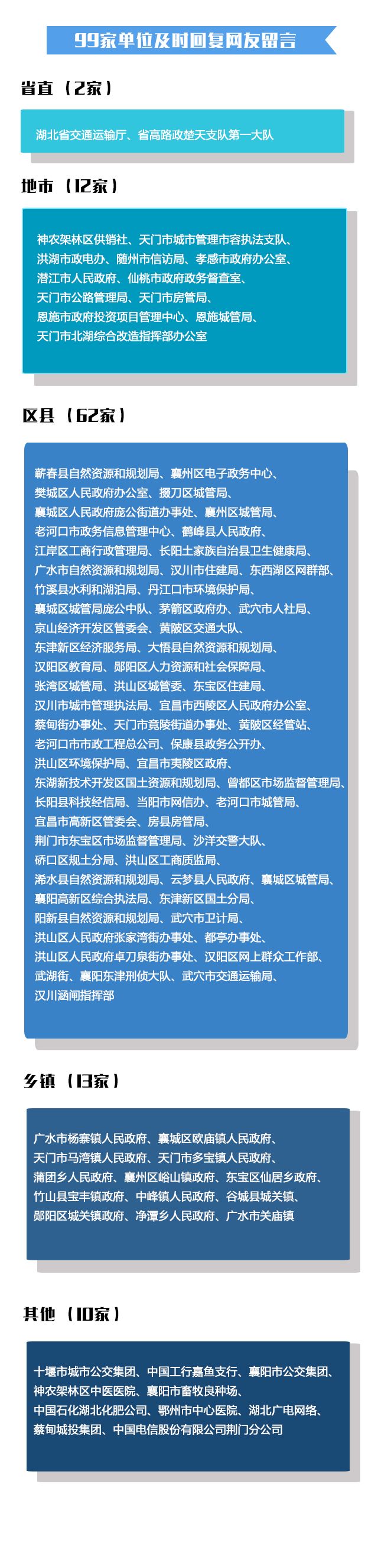 湖北省内各入驻单位及时回复网友留言,响应群众关切,栏目组代表广大网友表示诚挚感谢!同时,因各种原因,还有部分留言没有得到及时回复,如有回音,请在《民生热线》《荆楚问政》中及时给予回复。