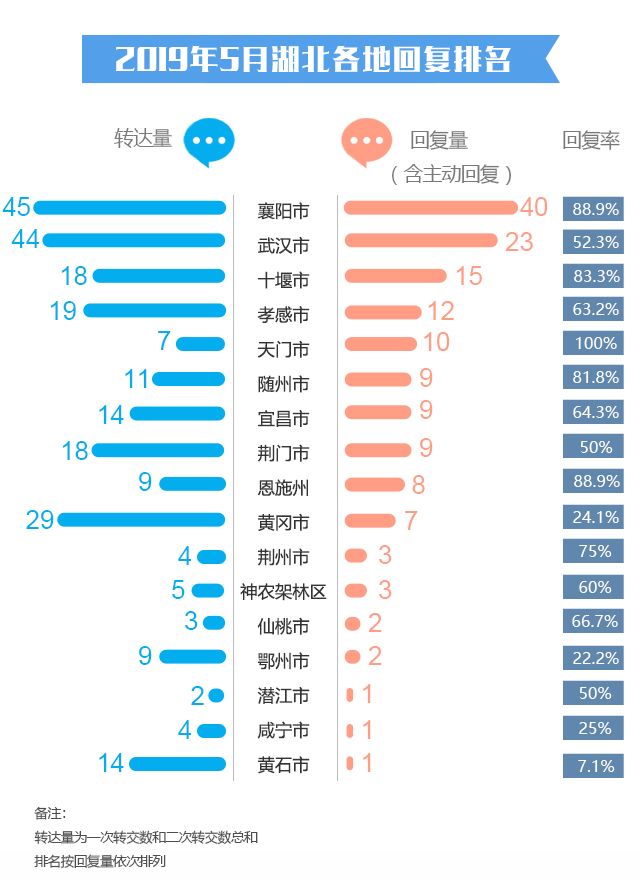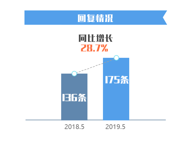 荆楚网客户端-荆楚网消息(记者 刘文颖)2019年5月,《荆楚问政》《民生热线》共收到242条网友留言,有175条留言得到相关部门回复,同比增长28.7%。截至6月5日,《荆楚问政》平台已有41个政府部门认领了《荆楚问政》平台账号,共回复网友留言76条。