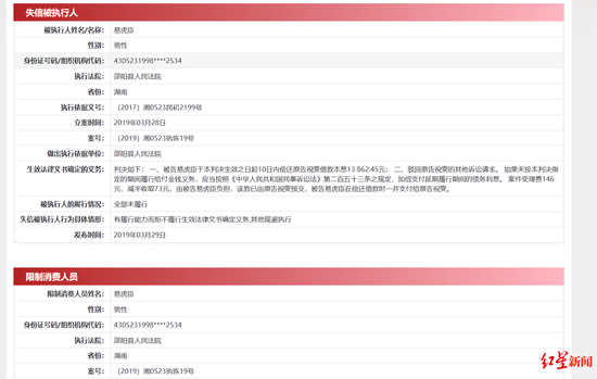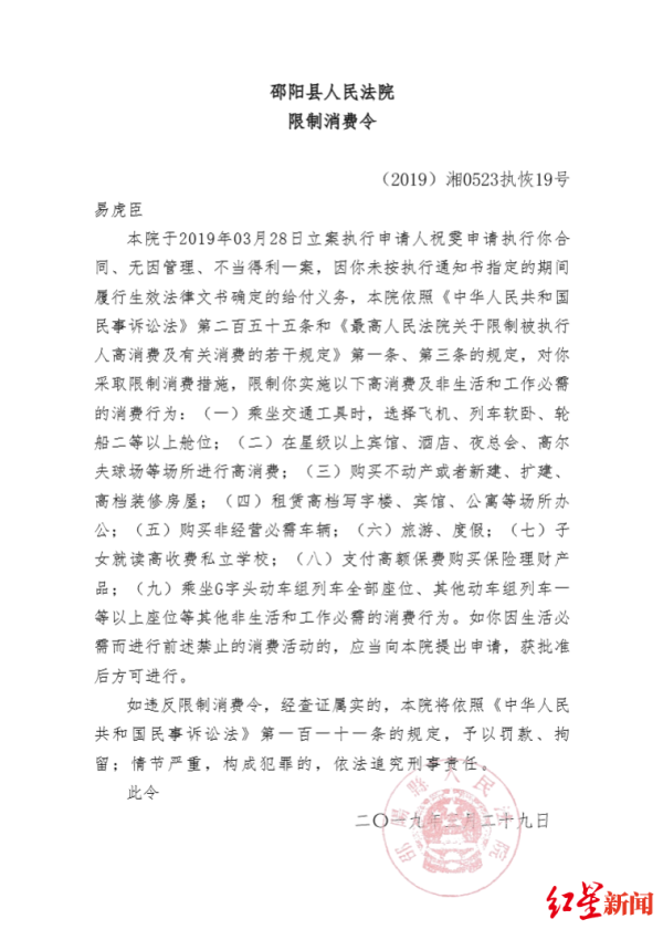 红星新闻记者发现,五起案件中,被执行人的履行情况都显示:全部未履行。此外,邵阳县人民法院还对易虎臣作出限制消费令。根据规定,被采取限制消费措施后,易虎臣不得有以下高消费及非生活和工作必需的消费行为:乘坐交通工具时,选择飞机、列车软卧、轮船二等以上舱位;在星级以上宾馆、酒店、夜总会、高尔夫球场等场所进行高消费;购买非经营必须车,旅游、度假等其他非生活和工作必需的消费行为。