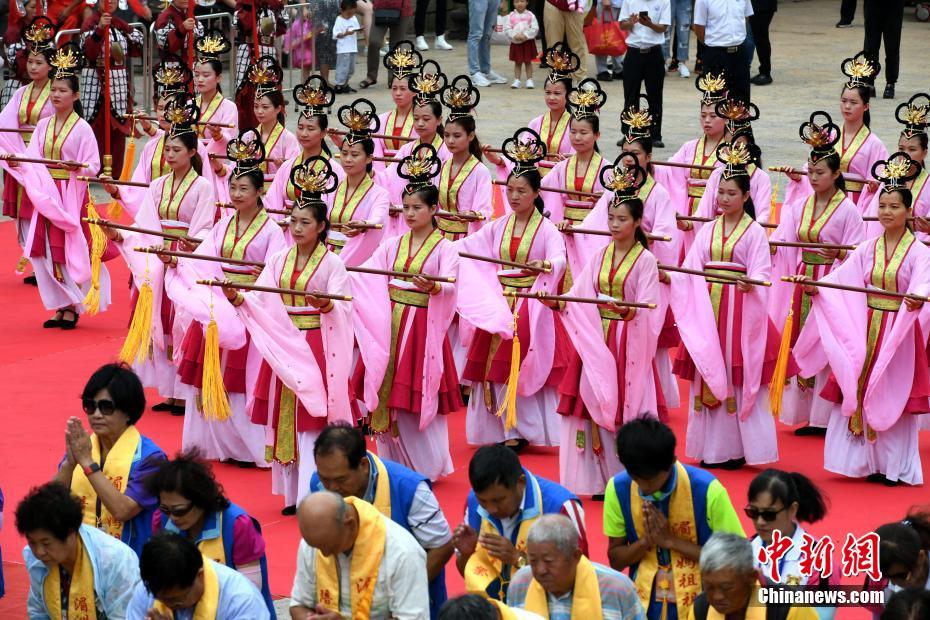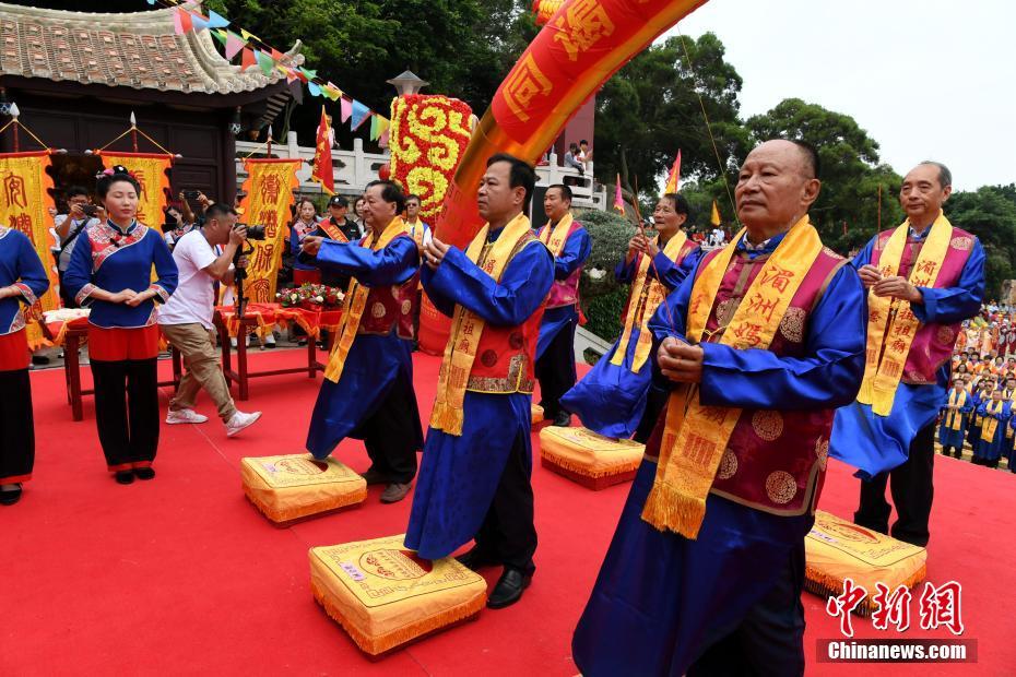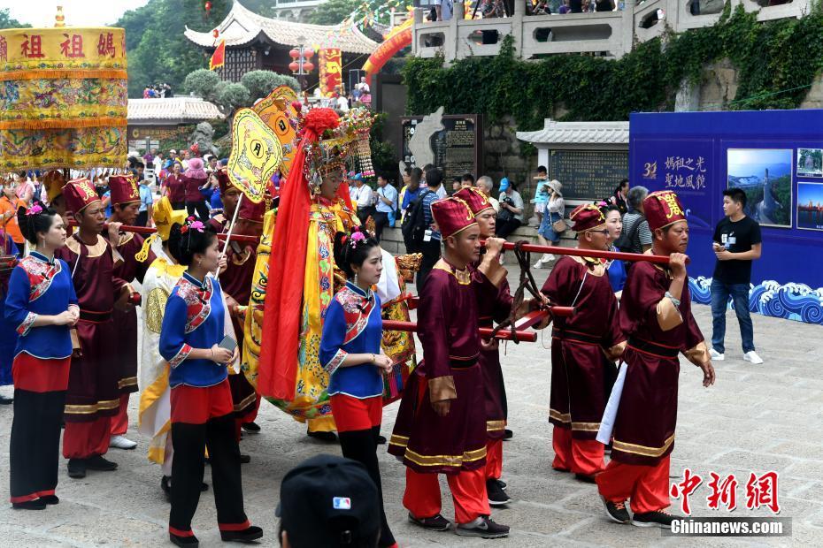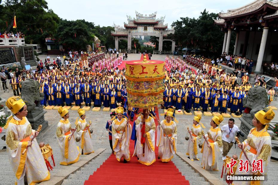 6月9日,来自台湾的38家妈祖宫庙信众代表与湄洲岛妈祖信众一起在福建省湄洲岛妈祖祖庙共谒妈祖。当日,台湾渔船直航湄洲朝拜妈祖30周年纪念活动在湄洲岛举行。中新社记者 王东明 摄