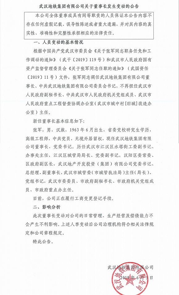 界面新闻从中国债券信息网获悉,武汉地铁集团有限公司6月5日发布关于董事长变更的公告,张军调任武汉地铁集团有限公司董事长、中共武汉地铁集团有限公司委员会书记,不再担任武汉市人民政府副秘书长、中共武汉市人民政府机关党组成员、武汉市人民政府重点工程督查协调办公室(武汉市城中村[旧城]改造办公室)主任。