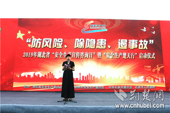 荆楚网客户端-荆楚网消息(记者张城、实习生任碧琼 通讯员李伟、周怡)6月是全国第18个安全生产月,今年活动主题为“防风险、除隐患、遏事故”。6月12日,2019年湖北省“安全生产宣传咨询日”暨“安全生产楚天行”在石首市正式启动。省安委会办公室副主任、省应急管理厅副厅长闸源虹出席并讲话。