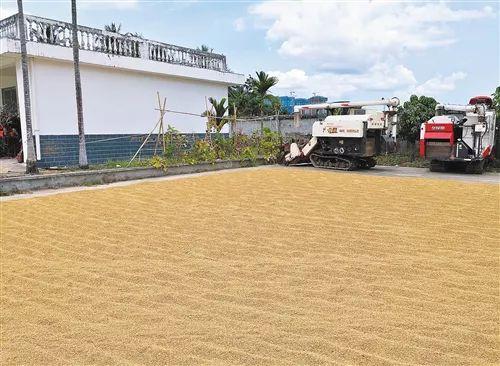 ↑安徽荃银高科种业公司南繁育种基地收获水稻后晾晒稻谷。荃银高科是我国籼型两系超级稻种子的主要供应商之一。(记者 乔金亮 摄)