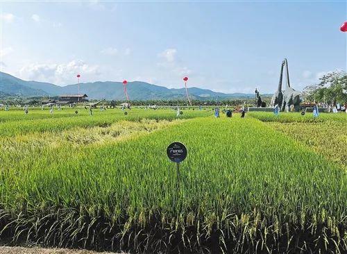 ↑位于海南三亚的水稻国家公园里,展示了众多超级稻品种,袁隆平院士团队的超级稻品种也在其中。(记者 乔金亮 摄)
