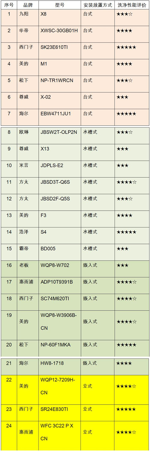 中国消费者协会13日在北京发布的一份报告指出,嵌入式、立式洗碗机的洗净效果优于其他类型的洗碗机,水槽式洗碗机干燥性能不理想。从测试结果来看,本次24个样品中,样品漂洗性能测试结果总体较好,洗涤剂残留较多的主要原因是洗碗机本身构造和程序有直接的关系,还和很多指标相关联,有的样品漂洗率高,机器本身设置程序中冲刷次数多,但同样增加了耗水量。