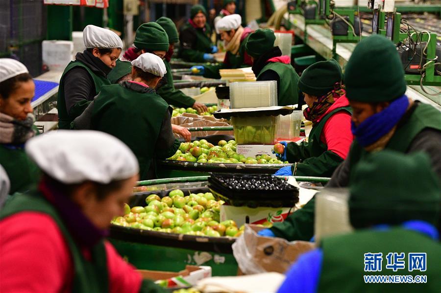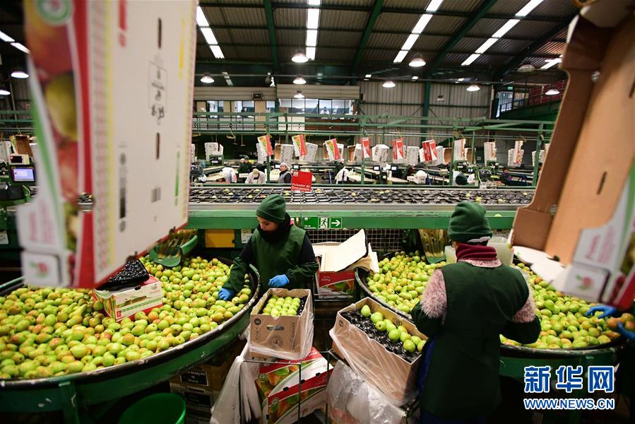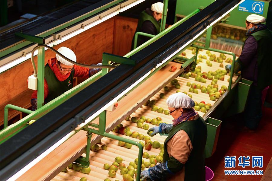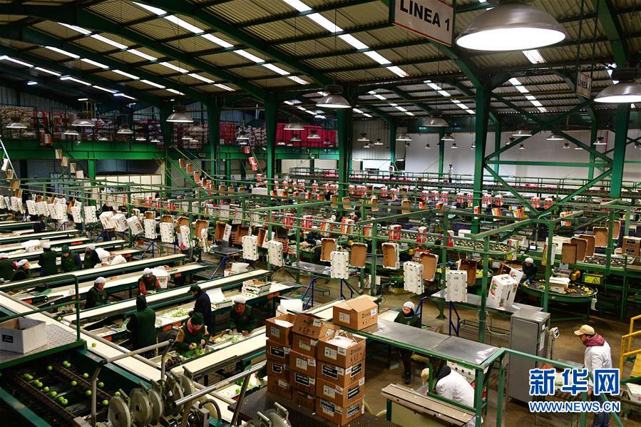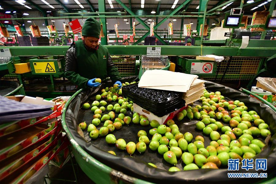 6月14日,在智利中部奥希金斯大区的圣费尔南多水果加工厂,工人在梨的生产线上工作。