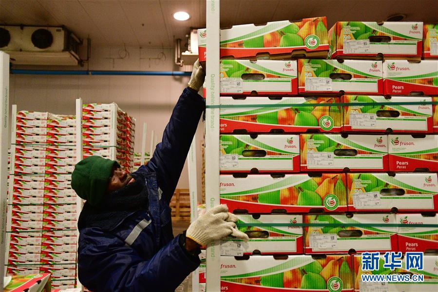 6月14日,在智利中部奥希金斯大区的圣费尔南多水果加工厂,包装好的梨即将运往港口。