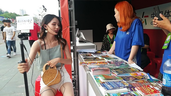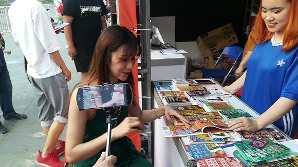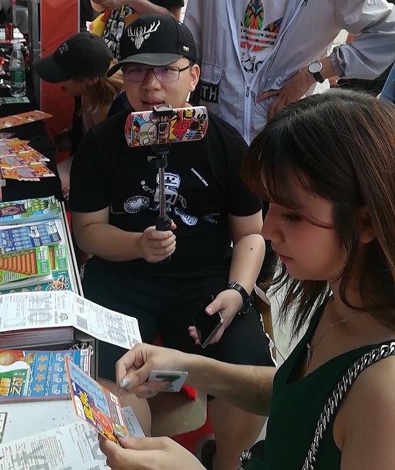 很多美女、帅哥网红主播,拿着自己形式各异的装备,坐在展位前开始体验顶呱刮的快乐!