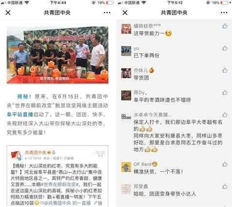 本次活动,@共青团中央在全平台进行了直播,微信公众号发布头条文章介绍本次直播活动与售卖的商品,发文一小时,阅读量即超过10W+,留言满满正能量,更有不少网友下单购买,以实际行动来支持贫困县的电商扶贫。