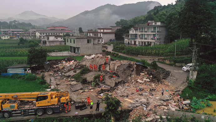 地震发生后,一张“地震致大楼倾斜”的照片在网上流传。图片中,一幢大楼几乎已成45度倾斜,一同流传的文字表示,这就是“宜宾,此时此刻”。今天上午,另有一张救援人员在该倾斜大楼现场救灾的照片也在网上流传。