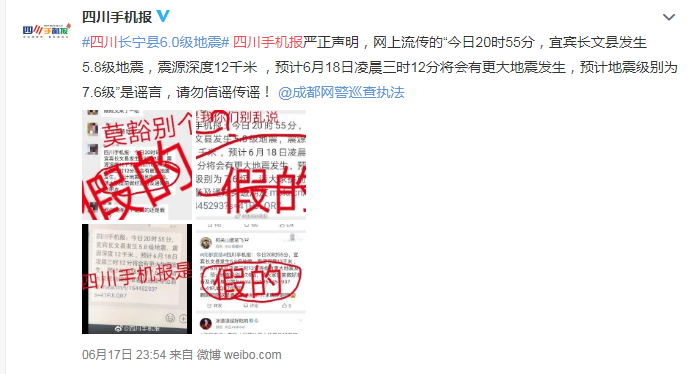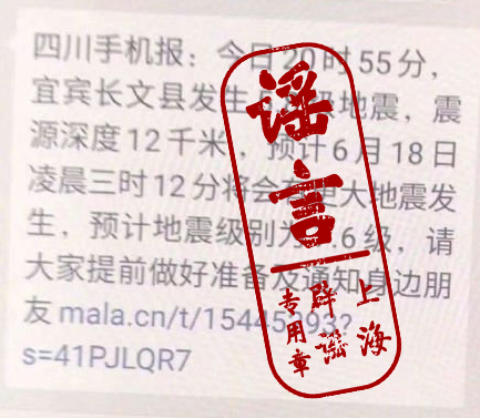 昨晚地震发生之后,微信群中流传一则“地震预报”。该信息以“四川手机报”名义发布称:“今日22时55分,四川宜宾长宁县发生5.0级地震。预计6月18日凌晨3时12分将有更大地震发生,预计地震级别为7.6级……”