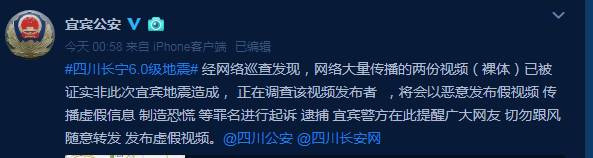 今天凌晨,四川省宜宾市公安局官方微博“@宜宾公安”发布微博澄清:“经网络巡查发现,网络大量传播的两份视频(裸体)已被证实非此次宜宾地震造成。正在调查该视频发布者,并将会以恶意发布假视频、传播虚假信息、制造恐慌等罪名进行起诉、逮捕。宜宾警方在此提醒广大网友,切勿跟风随意转发、发布虚假视频。”