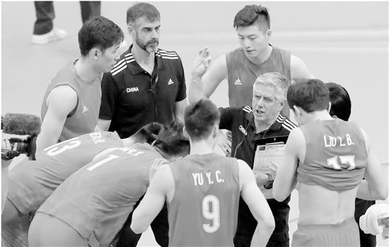 中国男排主教练洛萨诺(右三)在比赛间隙布置战术。新华社发