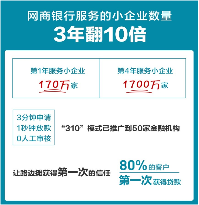 他说,网商银行成立一周年时,服务小微企业的数量只有170万家,今年达到了1700万家,3年时间翻了10倍,这说明网商银行独创的“310”模式开始显现规模效应。去年开始,网商银行把“310”模式开放给其他同行,目前,已经有50家金融机构也已经用上了“310”模式在给客户贷款。