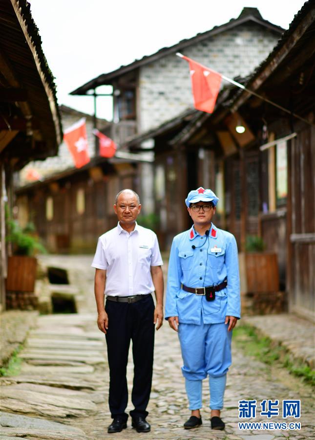 6月18日,钟鸣(左)与儿子钟振华结束一天的讲解工作后,在中复村的红军街上留影。 1983年,钟鸣开始在家乡中复村进行义务讲解工作,2015年他被政府聘用,成为一名正式的红色传统教育讲解员。他的儿子钟振华2017年起开始协助父亲从事红色传统教育、红色讲解的相关工作。 新华社记者魏培全摄