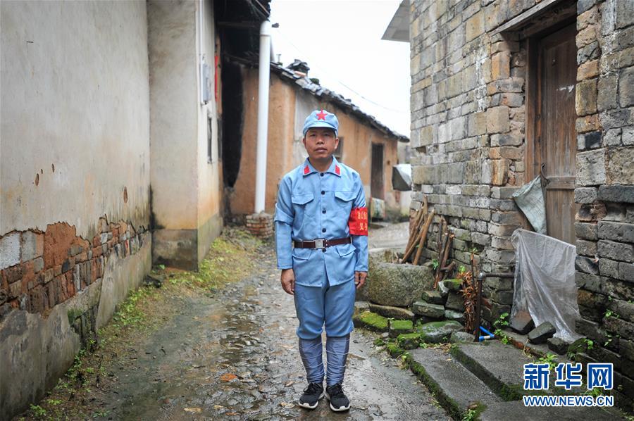 6月23日,在广东省南雄市油山镇上朔村,红军后代、红色讲解员黄树材站在红军当年走过的小巷。