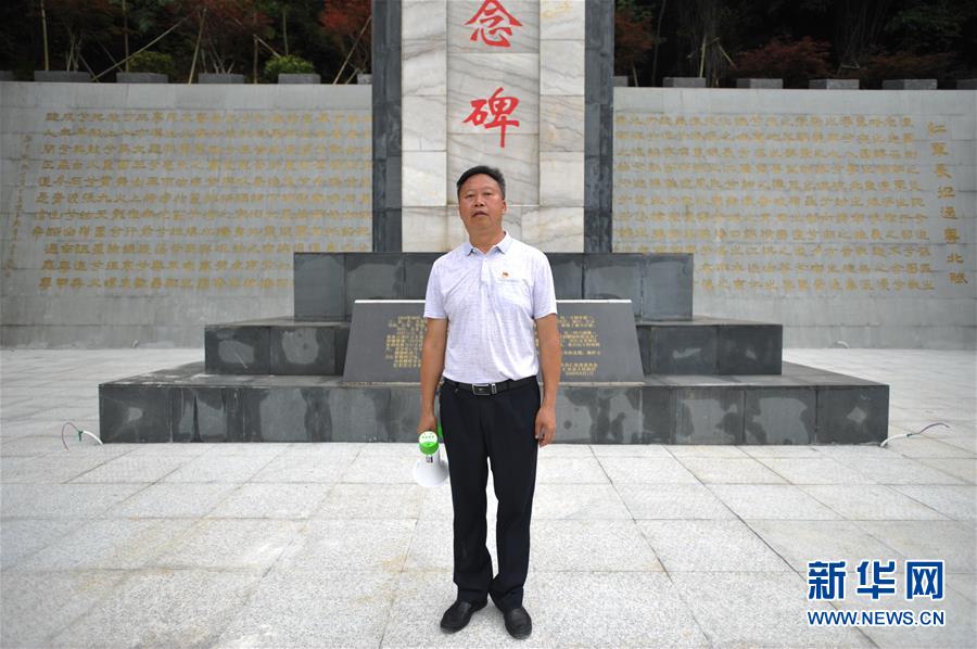 6月24日,仁化县文化站站长、红色讲解员黄本洲站在广东省韶关市仁化县铜鼓岭红军烈士纪念碑前。他已从事红色文化讲解工作五年左右。 新华社记者李任滋摄