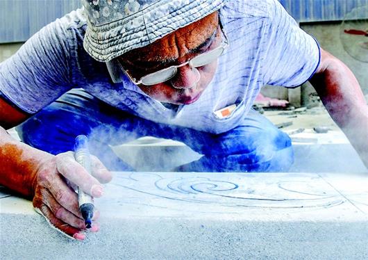图为尹本朋吹去积灰,在青石上画上需要雕刻的图案