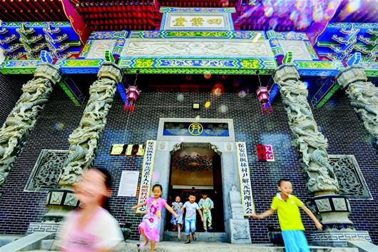 图为孩子们在雕龙的祠堂前玩耍