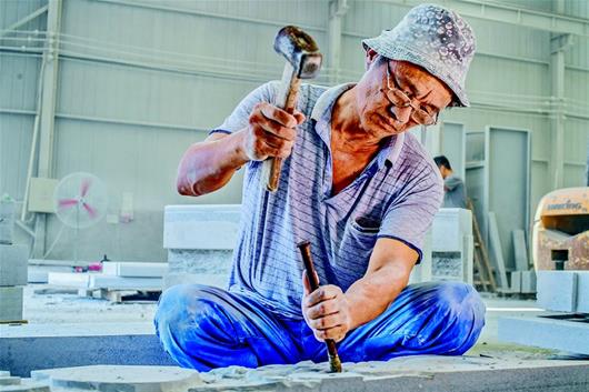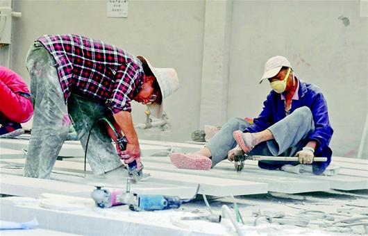 图为雕刻师傅们在青石板上雕刻