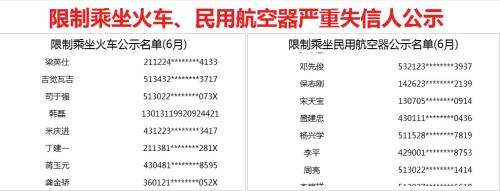 中新网客户端7月4日电(李金磊)国家公共信用信息中心3日公布2019年6月份新增失信联合惩戒对象公示,本月新增限制乘坐火车严重失信人524人,限制乘坐民用航空器严重失信人871人。严重危害正常医疗秩序黑名单方面,本月新增严重危害正常医疗秩序当事人177人。