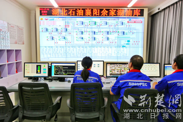 6月28日凌晨3点,中国石化销售华中公司襄阳场站李站长和同事在一楼中控室紧盯显示屏,关注着6月26日下午4点钟开始从荆门炼油厂管输发出的零号柴油的进程。凌晨3点18分,远在武汉的华中公司远控室下达输油命令。同时在场站二楼的余家湖油库中控室里等候的领导和同志们也把目光紧紧地注视在大屏幕上。一声令下,一键点击鼠标,电动闸阀瞬间打开了P203号柴油罐的阀门,柴油顺着管道被输入罐内。显示屏上立即显示出即时流速、油温、密度、体积、液位。大家相互拥抱、欢呼雀跃,成功的喜悦让困倦荡然无存,荆襄地下管输向余家湖油库投油一次性成功。