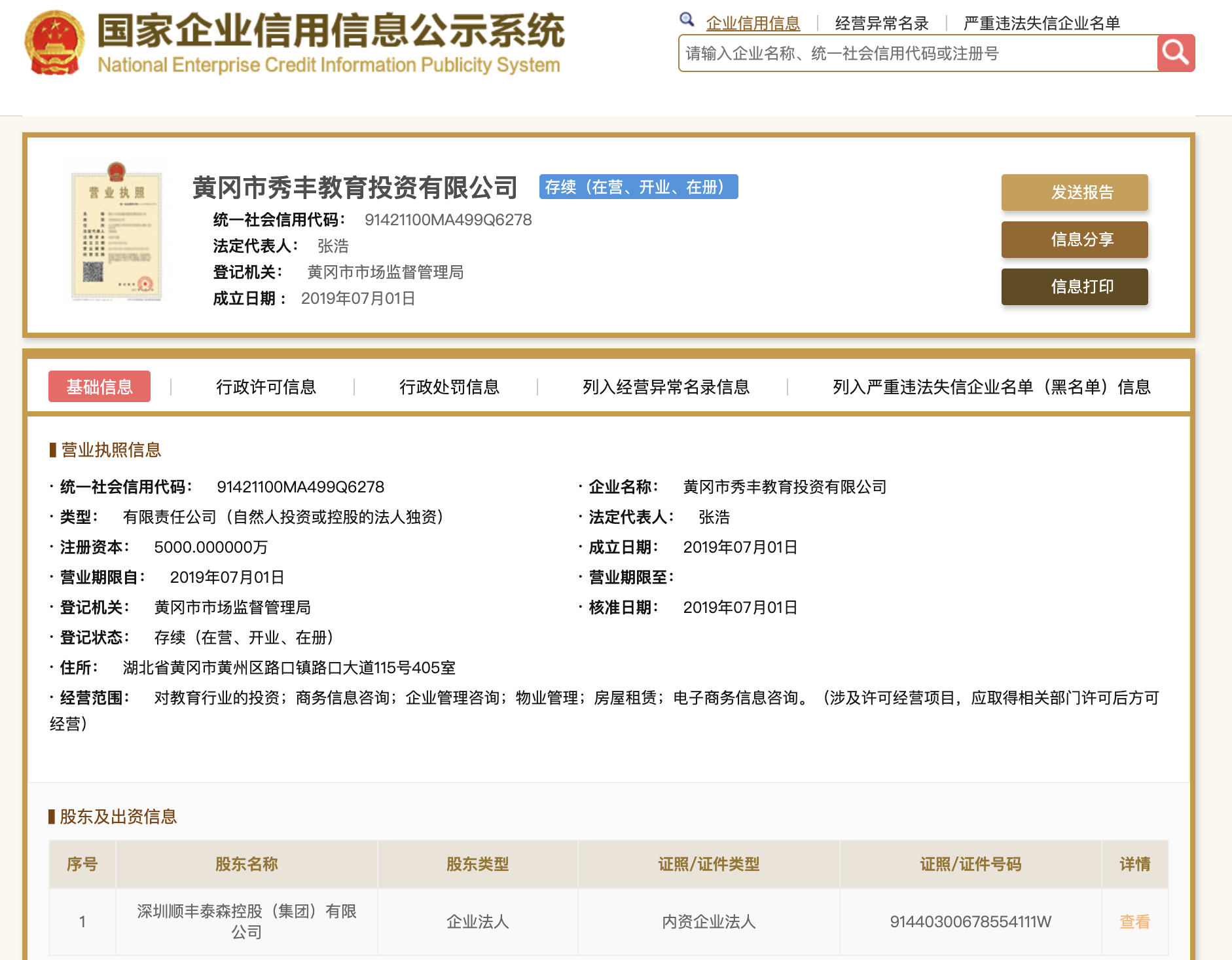 国家企业信用信息公示系统显示,黄冈市秀丰教育投资有限公司成立于2019年7月1日,注册资本5000万元人民币,法定代表人为张浩,经营范围包括对教育行业的投资、商务信息咨询、企业管理咨询、物业管理、房屋租赁、电子商务信息咨询。