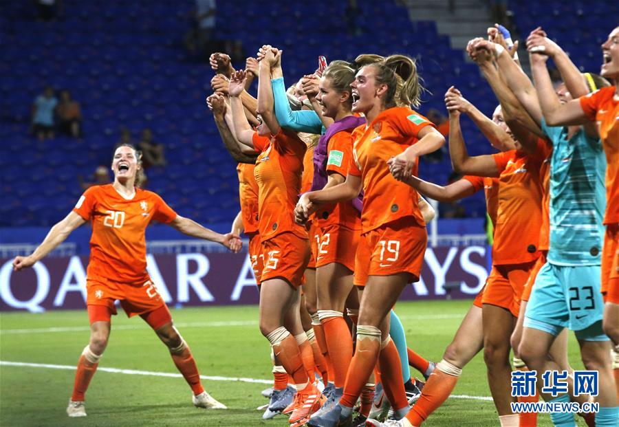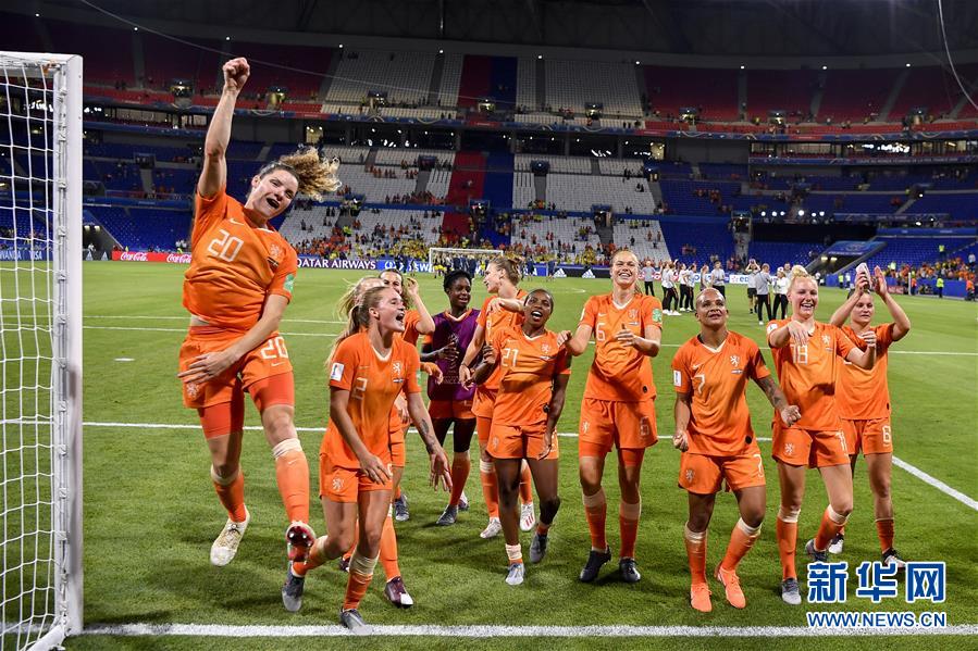 7月3日,荷兰队球员赛后庆祝胜利。 当日,在法国里昂举行的2019年国际足联女足世界杯半决赛中,荷兰队在加时赛中攻入一球,以1比0战胜瑞典队,晋级决赛。 新华社记者丁旭摄