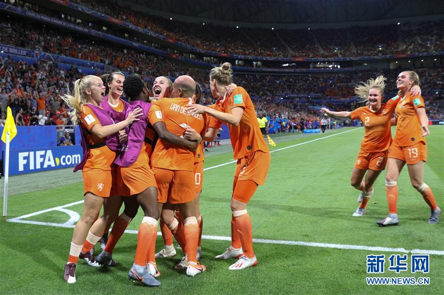 7月3日,荷兰队球员在获胜后庆祝。 当日,在法国里昂举行的2019年国际足联女足世界杯半决赛中,荷兰队在加时赛中攻入一球,以1比0战胜瑞典队,晋级决赛。 新华社记徐子鉴摄
