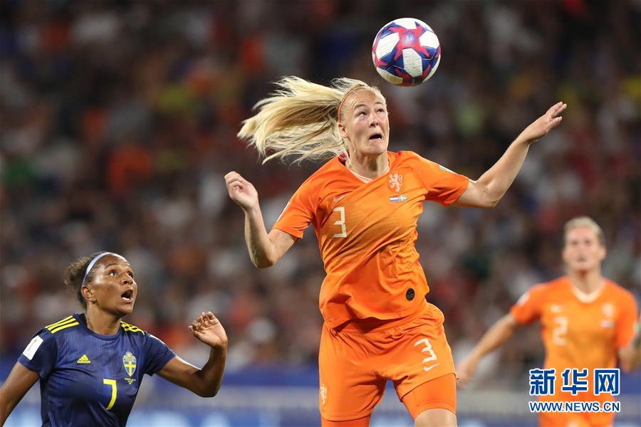 7月3日,荷兰队球员范德格拉特(中)在比赛中争顶。 当日,在法国里昂举行的2019年国际足联女足世界杯半决赛中,荷兰队在加时赛中攻入一球,以1比0战胜瑞典队,晋级决赛。 新华社记者徐子鉴摄