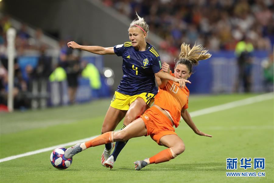 7月3日,荷兰队球员布拉德沃思(左)与瑞典队球员布拉克斯特纽斯在比赛中拼抢。 当日,在法国里昂举行的2019年国际足联女足世界杯半决赛中,荷兰队在加时赛中攻入一球,以1比0战胜瑞典队,晋级决赛。 新华社记者徐子鉴摄