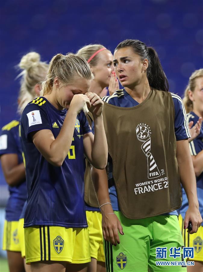 7月3日,瑞典队球员埃里克松(前左)在比赛后神情低落。 当日,在法国里昂举行的2019年国际足联女足世界杯半决赛中,荷兰队在加时赛中攻入一球,以1比0战胜瑞典队,晋级决赛。 新华社记者徐子鉴摄
