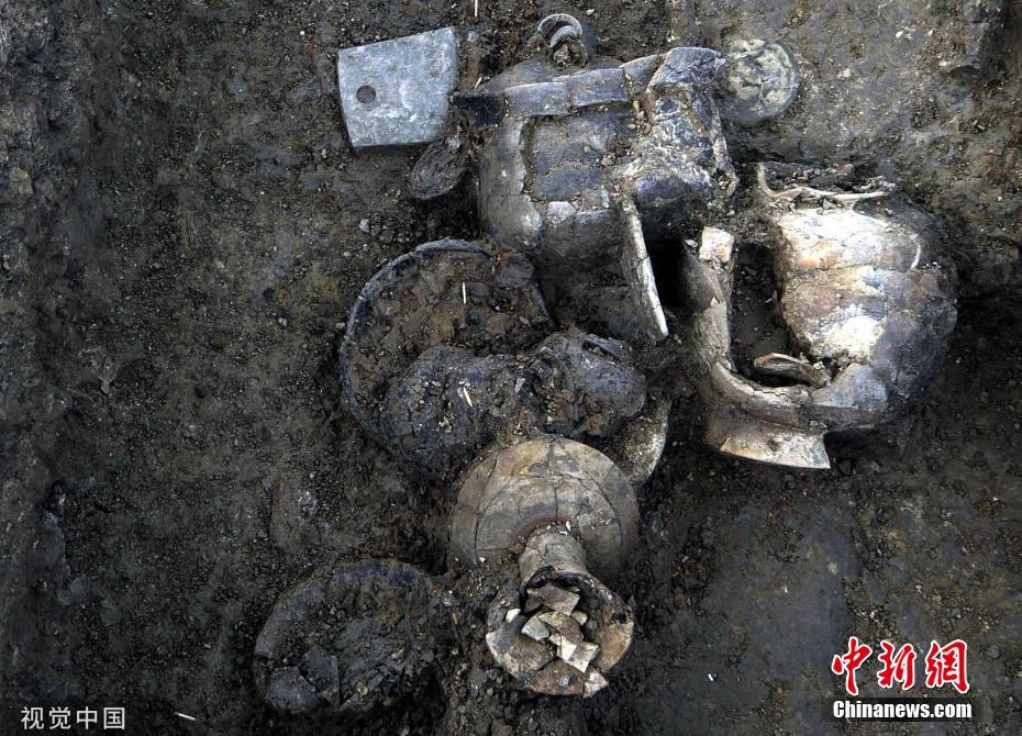 - 良渚遗址中出土的陶制器物品类多样,有炊煮器、盛食器、酒水器和存贮器。图为考古专家们在小兜里遗址上发掘出一批保存完好的良渚石钺等石器、陶器。图片来源:视觉中国