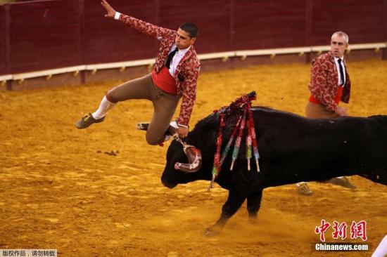 资料图:当地时间2019年4月13日,葡萄牙里斯本坎普佩克诺斗牛场上演惊险刺激的斗牛比赛,一名斗牛士在表演时不慎被愤怒的公牛顶翻在地,现场一片混乱。