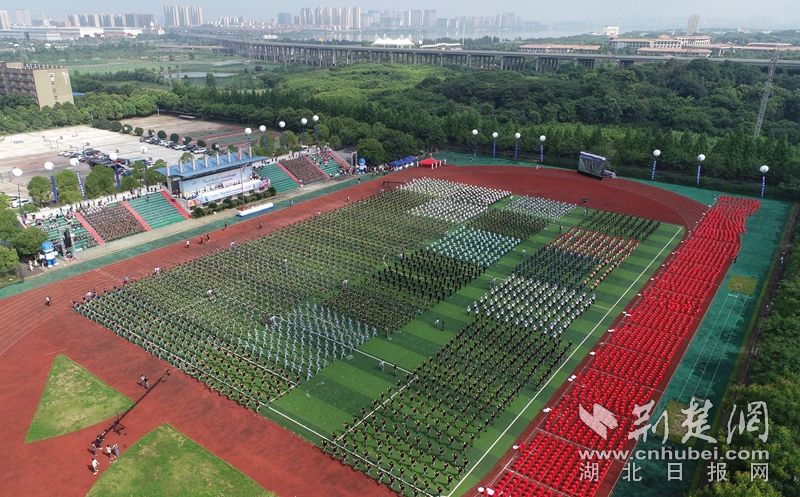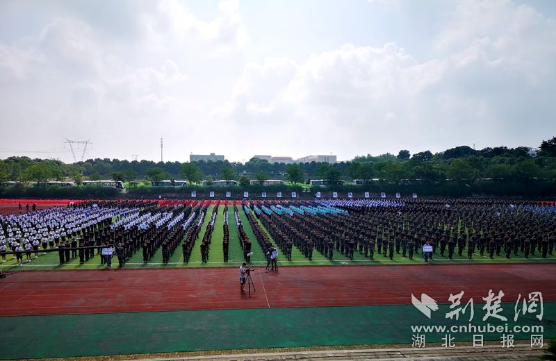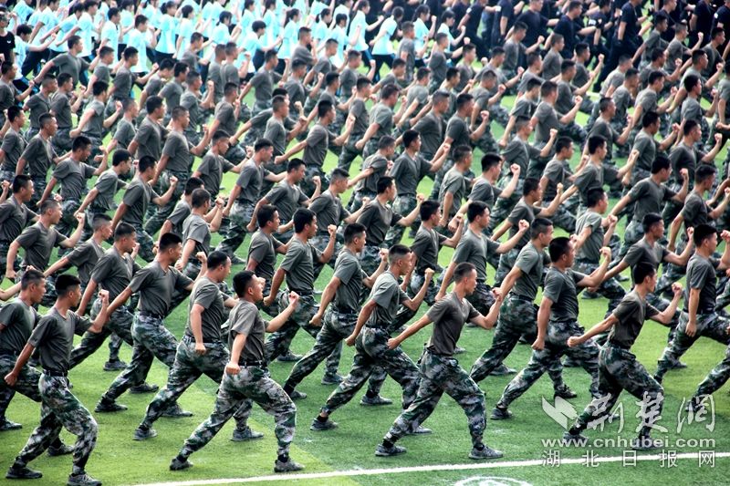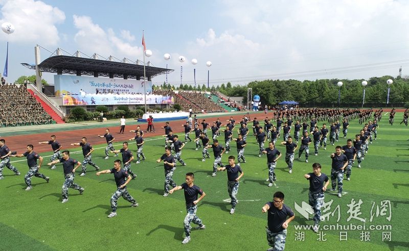 荆楚网客户端-荆楚网消息(记者陈泉)7月10日,第七届世界军人运动会进入倒计时100天。参加“迎军运万人军体拳挑战赛”总决赛的26支参赛队,共2600人在武昌职业学院同打军体拳,喜迎第七届世界军人运动会召开。