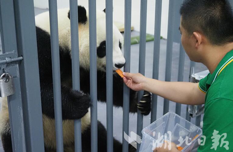- 图为饲养员正给“春俏”喂胡萝卜。(武汉动物园供图)