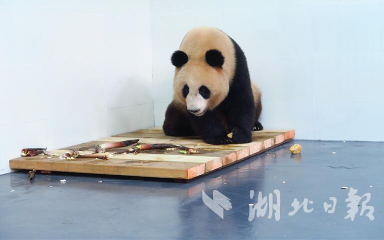 - 根据大熊猫不同时期的生理需求,武汉动物园准备了丰富的食物,包括竹子、竹笋、胡萝卜、苹果、窝窝头、善存、钙尔奇、蜂蜜等。窝窝头严格按照中心的标准,含黄豆、玉米、大米、白糖、磷酸氢钙、盐、鸡蛋等,按一定比例加工制作。图为“春俏”在吃竹子。