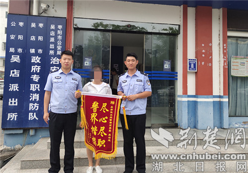 荆楚网客户端—荆楚网消息(通讯员 孟溪)7月11日一大早,家住枣阳市吴店镇的李女士就来到枣阳市公安局吴店派出所,将一面印有“尽心尽职,警界楷模”的锦旗送到派出所民警手中,感谢公安机关执法公正,维护其人身财产权益。